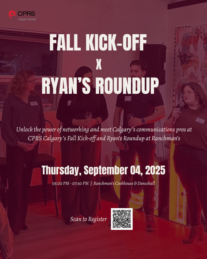 Thursday, September 4 — doors open at 5:00 PM | Ranchman’s Cookhouse & Dancehall, 9615 Macleod Trail S, Calgary, AB T2J 0P6 Free entry (18+ only) Join us as we kick off the upcoming CPRS Calgary season at Ryan’s Roundup! This is your chance to connect with fellow PR and communications professionals, meet members,…