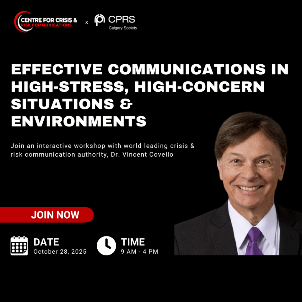 Join Dr. Vincent Covello and the team at the Centre for Crisis & Risk Communications for a day exploring principles, theories, and tools that support Effective Communication in High-Stress, High-Concern Situations & Environments. Date: October 28, 2025, 8:30 a.m. – 4:00 p.m. Venue: University of Calgary Downtown Campus, Room 241, 906 – 8 Avenue SW CPRS members receive a special…