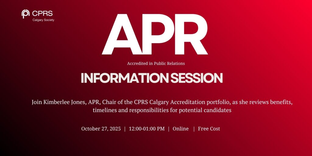 Monday, October 27, 2025 | 12:00-01:00 PM | Online Join us for an interactive online APR Information Session hosted by CPRS Calgary Accreditation Chair Kimberlee Jones, APR. This session is designed for communication professionals interested in pursuing their Accredited in Public Relations (APR) designation. During this event, you’ll learn: What the APR designation is and why it matters…